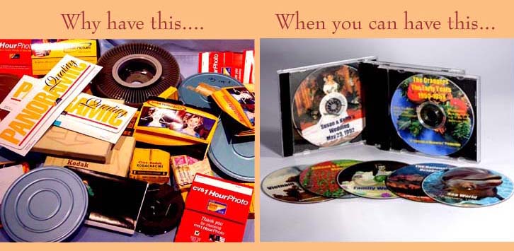 SLIDES. We convert slides and photos to either DVD or Flash Drive. It can be a personal presentation with titles or a slide show. We can photograph your favorite old slides for you to have a beautiful print or just to keep on a DVD. All DVDs come with a custom full color label directly imprinted on the disc with clearly marked contents with dates.